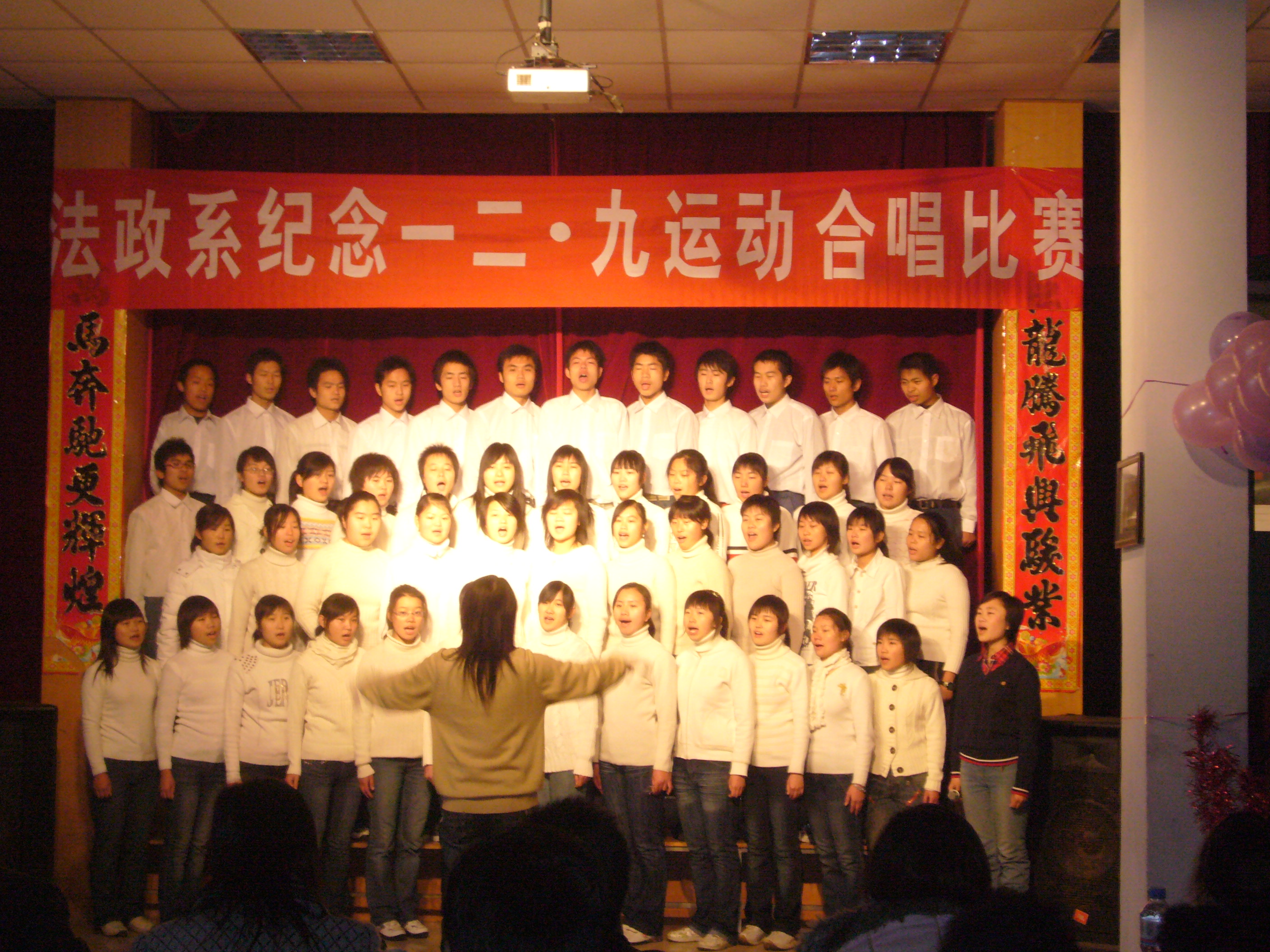 12月9日下午,法政系在大学生活动中心成功举办了纪念“一二•九”运动七十二周年合唱比赛。此次活动是法政系纪念“一二・九”爱国主义教育系列活动之一。法政系主任张宝峰教授、书记刘建秀教授、李燕华教授、副书记郭祥远、校团委田烟老师、分团委全体老师以及300多名学生一同观看了比赛。