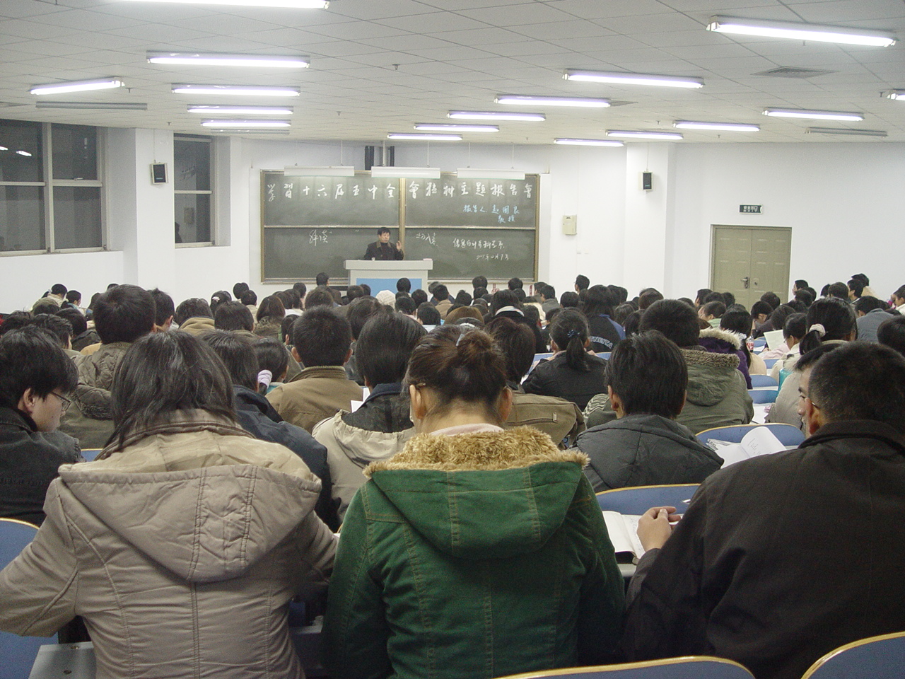 赵国良书记从我们所处的时代出发,从计划与规划、总量与人均、重要战略机遇期、经济增长方式、社会主义新农村、就业等六个方面对十六届五中全会进行了详细解读,并与大家深入交流了自己的学习体会和感受,最后赵国良教授希望同学们努力学习、继续深造、找到自己的位置,实现自己的价值。