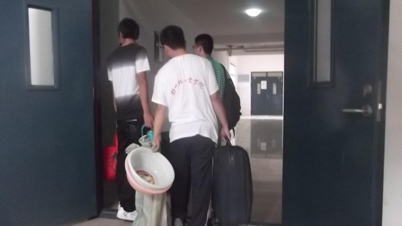 11点半,校车先行到达。各公寓楼外的后勤工作人员将寝室钥匙发给同学们,方便他们休息。11点40分,搬运车到位。在场的学院领导做出指示:“在确保不落下、不损害、不乱投一件行李的前提下,快速完成搬迁工作。”
