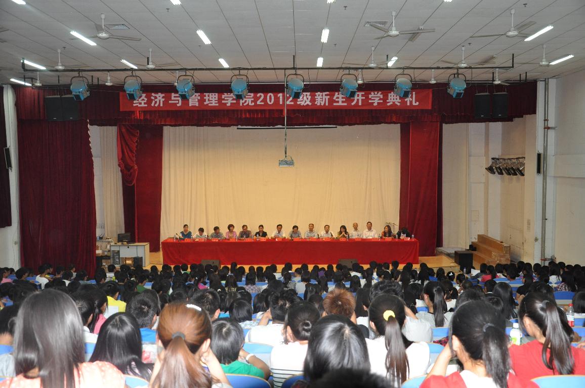 9月28日下午,经济与管理学院2012级新生开学典礼在我校科学校区电教楼208室隆重举行。经济与管理学院领导班子、各系负责人、办公室负责人、学生工作系统全体教师出席典礼仪式,我院2012级700余名新生参加了会议。典礼由经济与管理学院党总支副书记刘洪民主持。