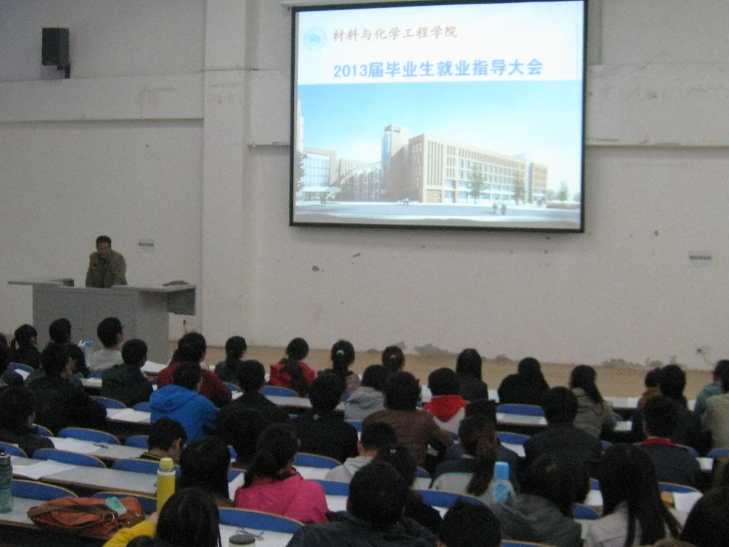 11月8日中午,材料与化学工程学院在科学校区电教楼408组织召开了2013届毕业生就业指导大会。出席大会的有学院党总支副书记周立明老师,学院毕业班辅导员万慧杰老师,以及全体2013届毕业生。