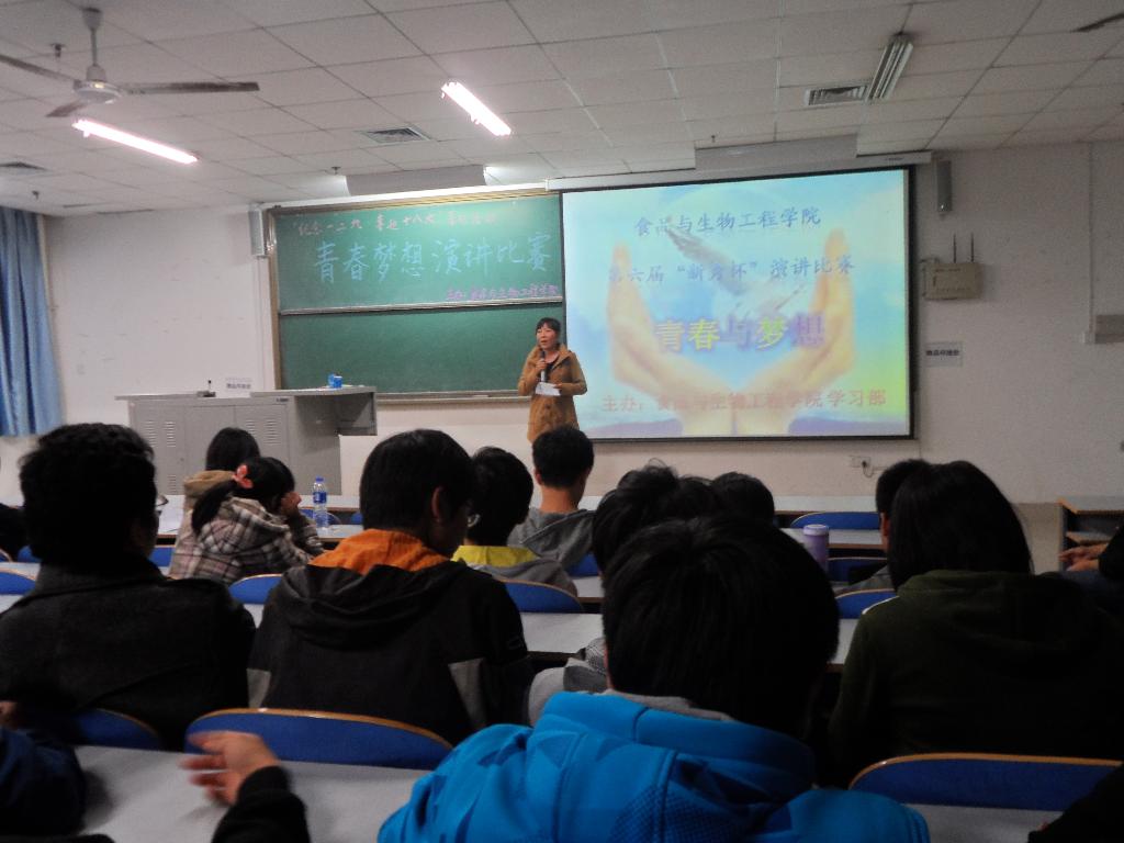 食品与生物工程学院“纪念一二九,喜迎十八大”之“放飞青春梦想,抒发爱国情怀”演讲比赛于11月8日下午在科学校区电教楼102教室成功举办。我院部分辅导员老师、32名参赛选手、110多位观众参与本次比赛。