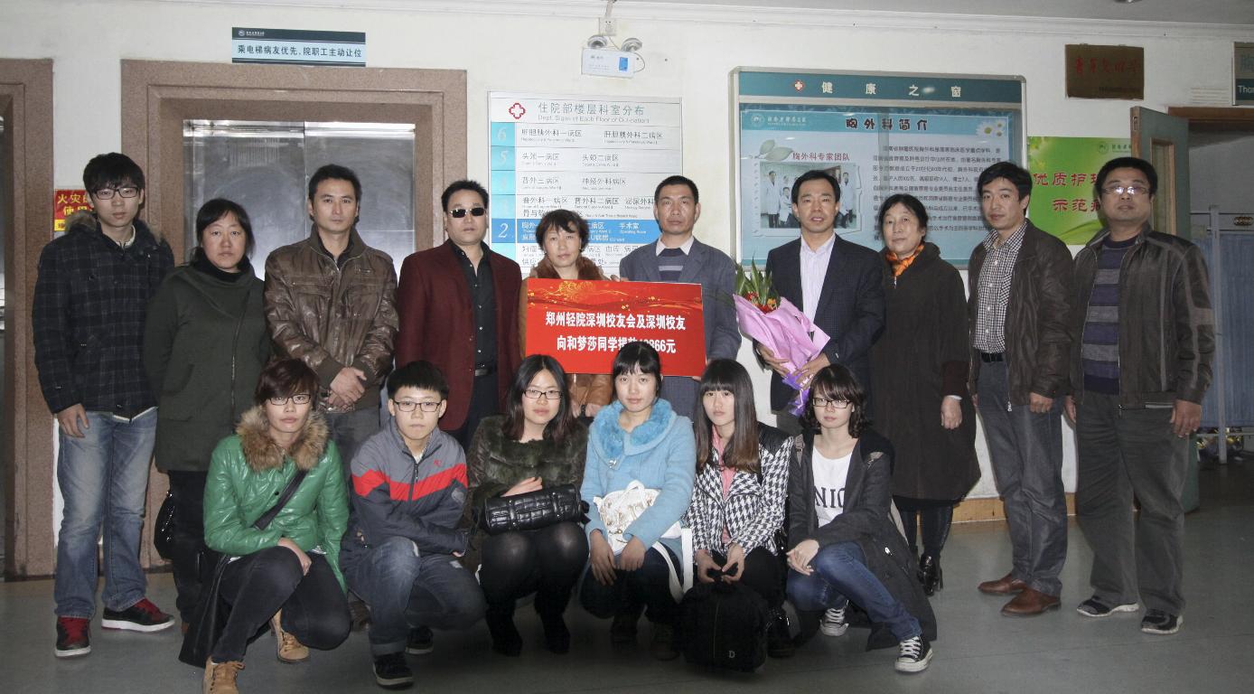 艺术设计学院传媒专业国家奖学金获得者和梦莎同学身患白血病得到了全校师生以及社会上爱心人士的热心帮助,远在深圳的轻院校友们听说和梦莎同学的事情之后,不忘母校恩情,立即伸出援助之手。深圳校友会设立专门捐款帐号,专人负责,几天时间收到爱心捐款48866元。11月10日下午,深圳校友会常务副会长郭宏伟、副会长雷达代表深圳校友会,冒着严寒,不辞辛苦赶到郑州,将爱心捐款送到和梦莎同学的父母手中,同时也给予梦莎同学及其家人深切的关心和问候。