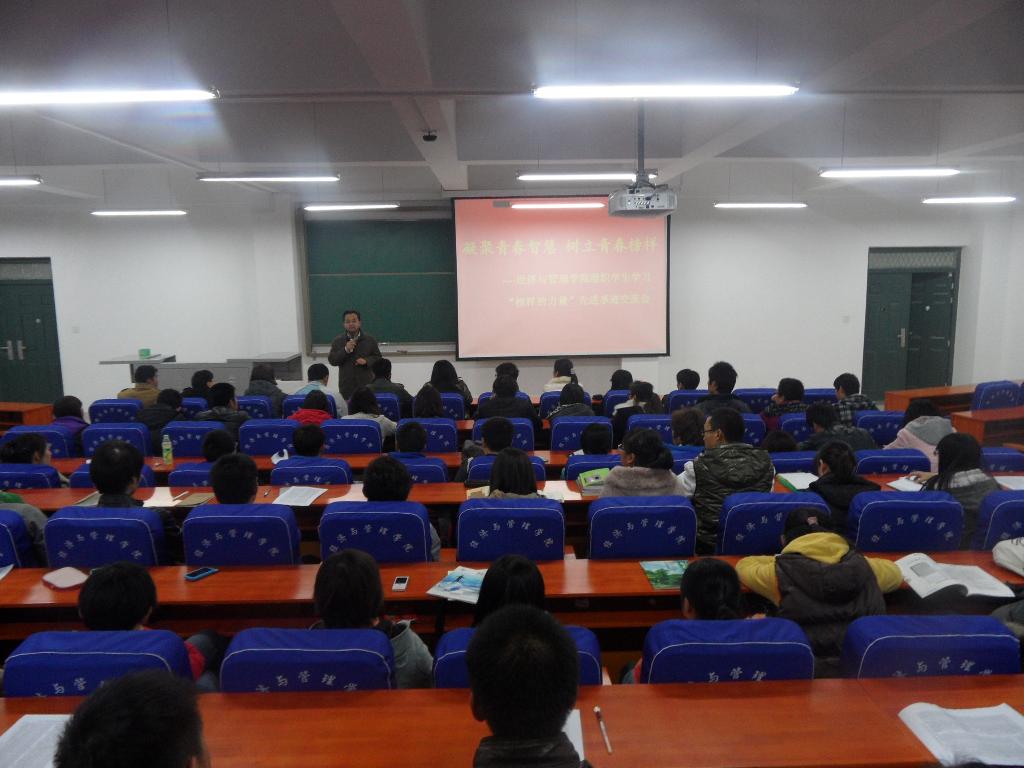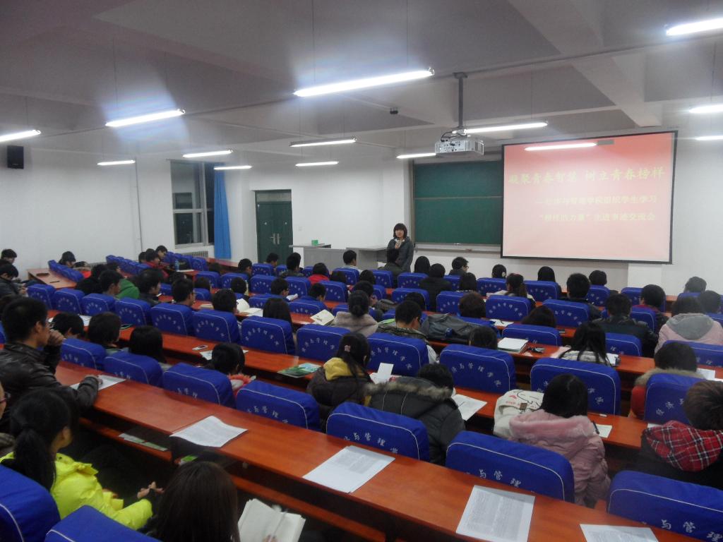 11月15日下午,我院组织2012级全体新生在科学校区电教楼208聆听了由校学工部、校团委主办的首届“轻院学子·榜样力量”优秀大学生先进事迹报告会,学生反应热烈。会后,我院组织学生会、年级团总支学生干部及学生代表150余人参加了学习“轻院学子·榜样的力量”先进事迹交流会。经济与管理学院党总支副书记刘洪民,分团委老师及新生辅导员参加了交流会。
