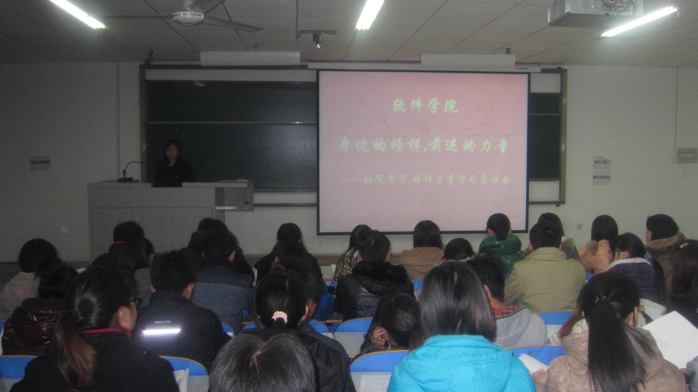 11月15日晚上七点,软件学院组织2012级全体新生在电教楼208聆听了由校学工部、校团委主办的首届“轻院学子·榜样力量”优秀大学生先进事迹报告会,报告团成员以自己的亲身经历向同学们展示和分享了精彩缤纷的大学生活,引起了现场学生的强烈共鸣。为了进一步加强对学生的教育和引导,软件学院举行了系列学习交流活动,掀起了向“榜样”学习的高潮。