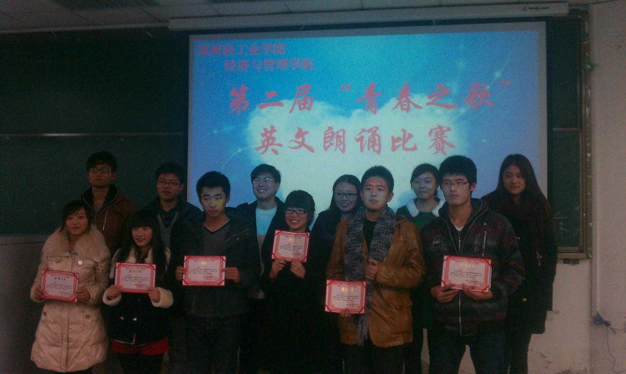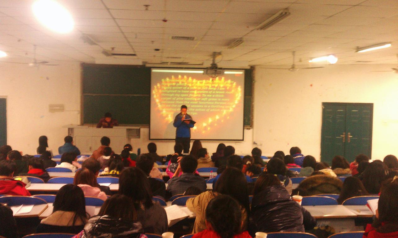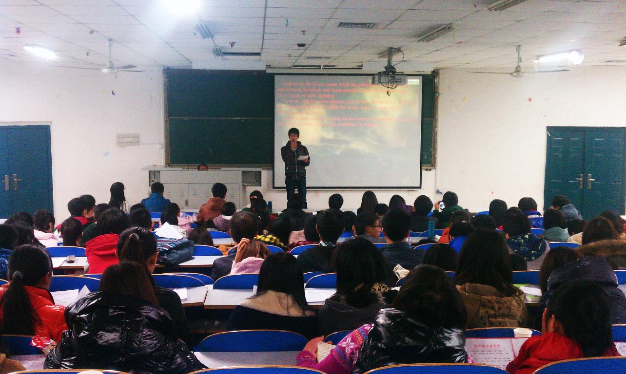为了提高同学们学习英语的热情和兴趣,增强口语表达能力,丰富大学生的课余文化生活,充分展现英语语言魅力,11月25日晚7:00,经济与管理学院在科学校区电教楼108室成功举办了第二届“青春之歌”英文朗诵比赛。