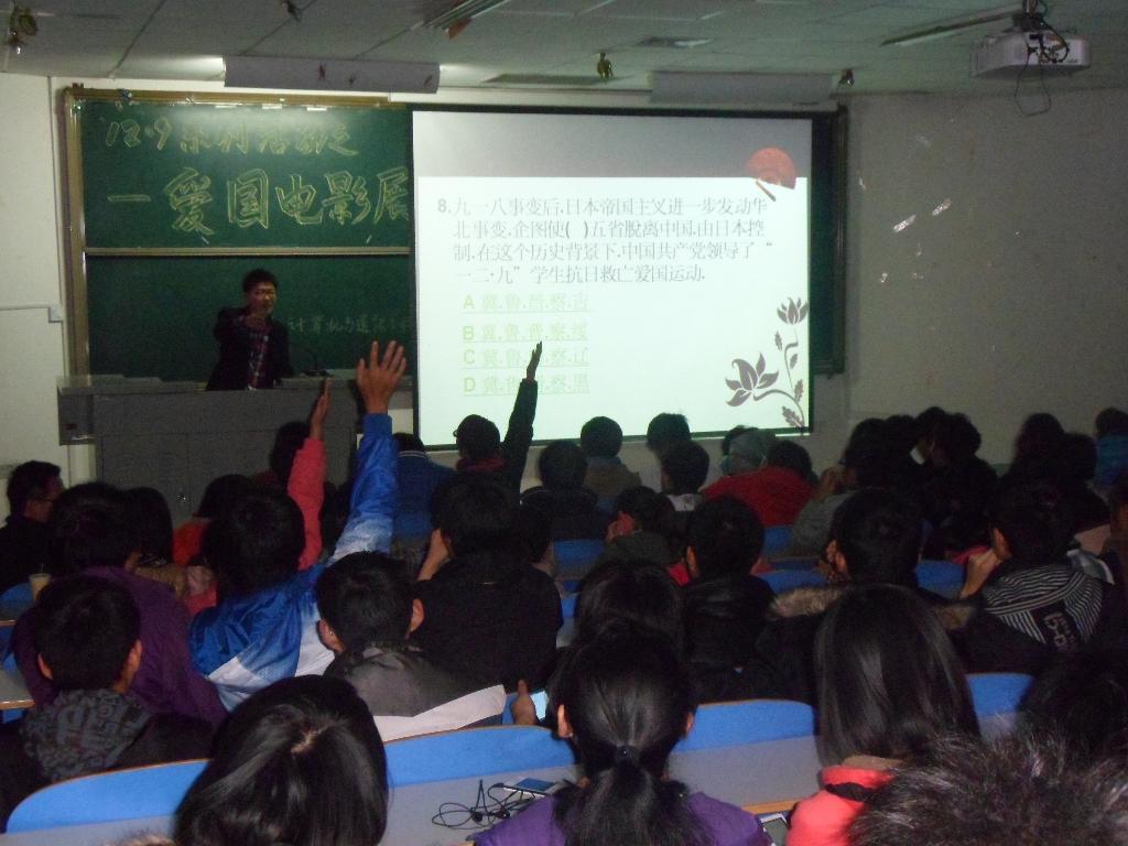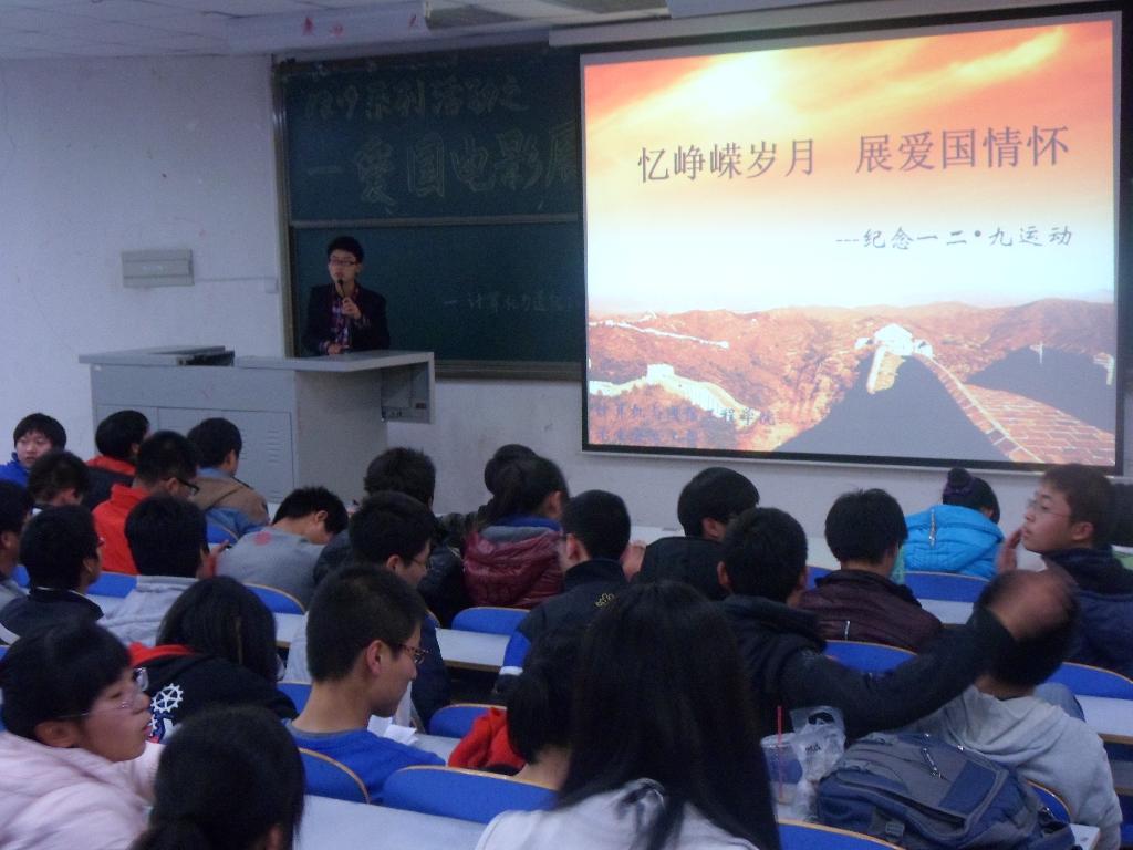 活动首先由主持人放映幻灯片,通过大量的视频和图片带领大家回顾历史,使同学们对于“一二•九”运动有一个更加直观的认识,紧接着播放了一系列爱国电影。学生们聚精会神的观看电影,大家纷纷被影片中主人公热爱祖国,舍身忘我的精神所感动,有的甚至流下了感动的眼泪。同学们表示,回顾和纪念历史是为了更好地前行,要把通过纪念活动获取的精神动力转化为实际的行动。要学习宣传贯彻党的十八大精神,以实际行动来继承发扬先辈精神。