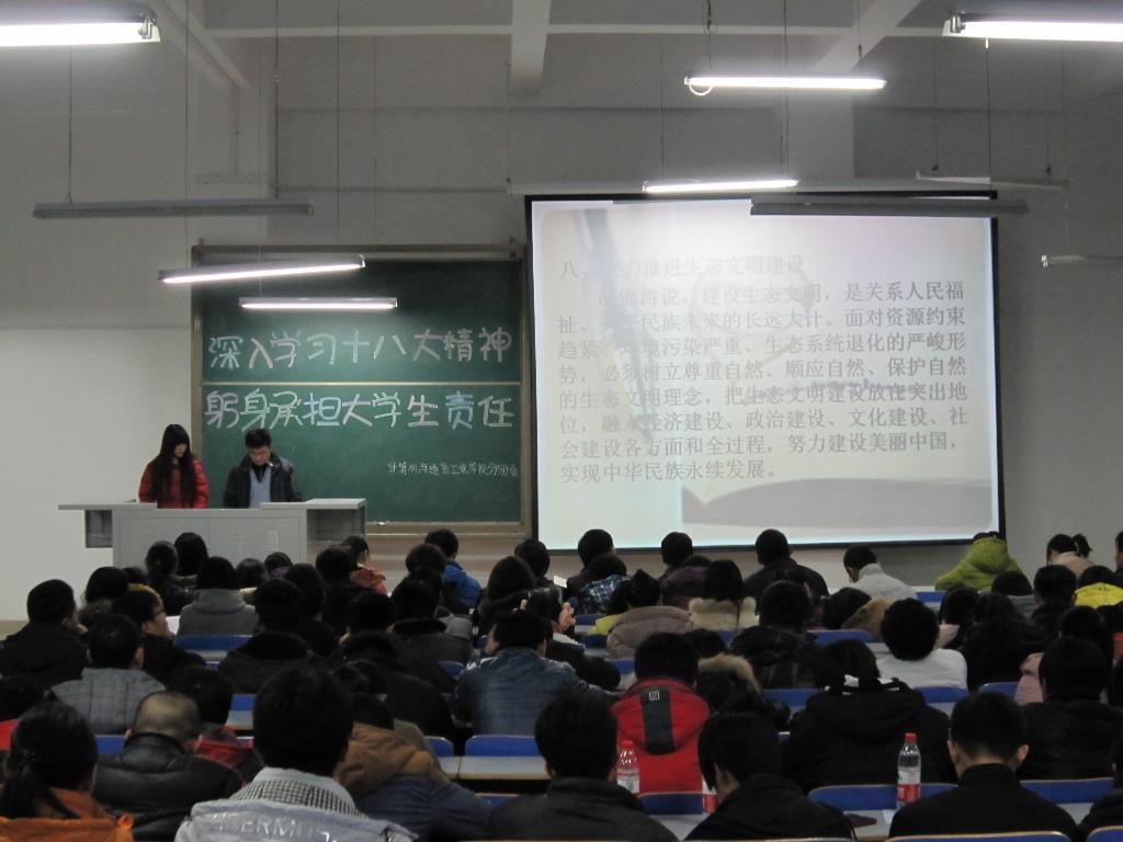 会上,主持人首先带领同学们学习了党的十八大会议相关精神,希望广大团干部和团员青年能够集中精力、认真研读党的十八大文件,原原本本学习十八大报告和党章,全面准确领会和落实党的十八大精神。针对十八大会议的主体内容,通过对“坚定不移走中国特色社会主义道路”、“加快完善社会主义市场经济体制和加快转变经济发展方式”、“推进社会主义文化强国建设”、“大力推进生态文明建设”、“加快推进国防和军队现代化”等关键词的理解,进而领会其精神实质,将党的指导思想和理论方针深入贯彻到学生们的心中。