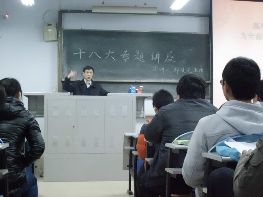 郭晓先老师从“旗帜鲜明 信心坚定”、“科学布局 攻坚克难”、“复兴大业 关键在党”、“学习精神贵在行动”等四个方面对大会的时代背景,主题做了解析,对“十八大”提出新时期的新任务进行了阐述,他号召党员干部和团员青年深刻领会会议精神,以极大热情投入到全面小康社会的建设中去。郭老师的讲解诙谐幽默又不失深度,同学们受益匪浅。