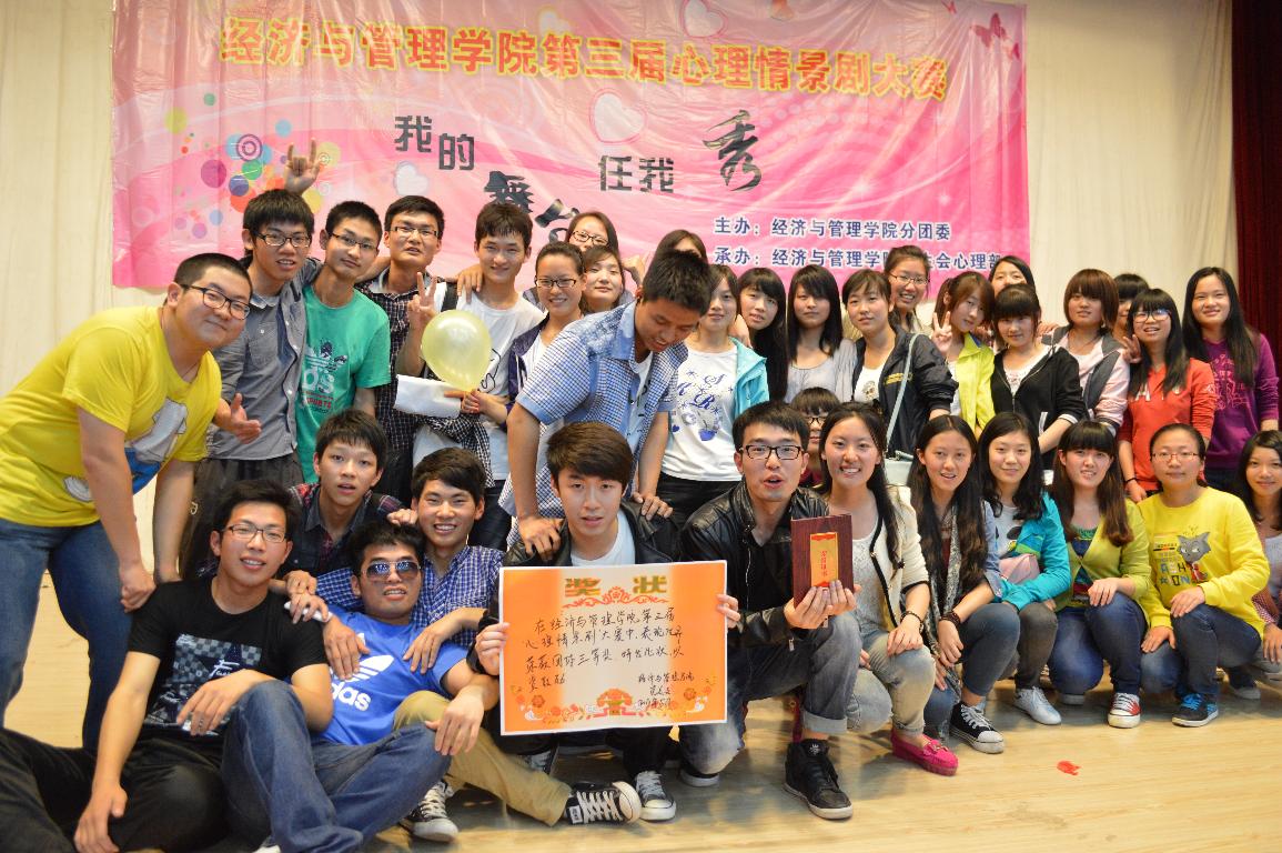 为了进一步提高同学们的心理健康素质,传播心理健康与理念,激发同学们对身边生活的体验,关注自我心灵的健康,形成一种发现、思考、解决心理健康问题的新方式,2013年5月8日晚上7:00,经济与管理学院在我校科学校区电教楼208室隆重举行了我院第三届心理情景剧大赛。