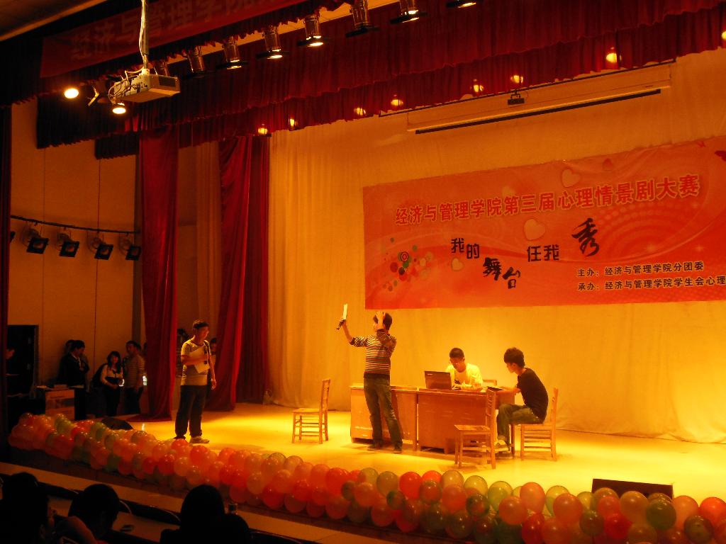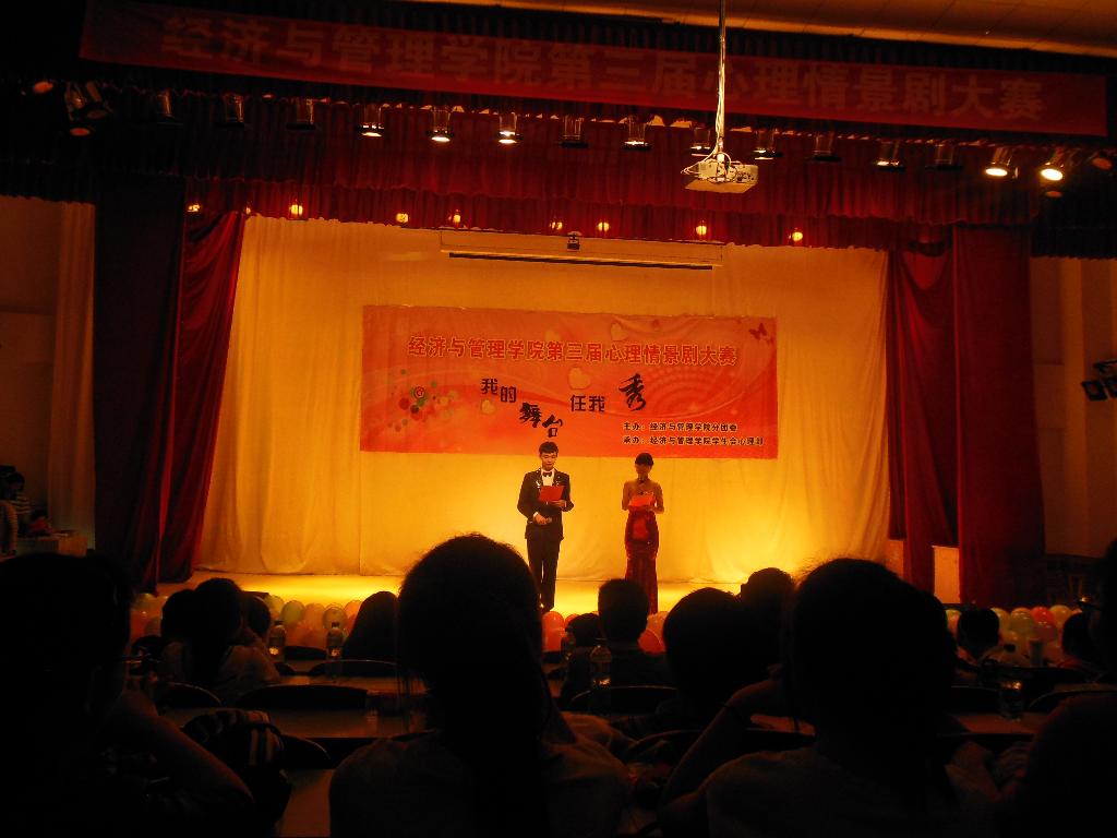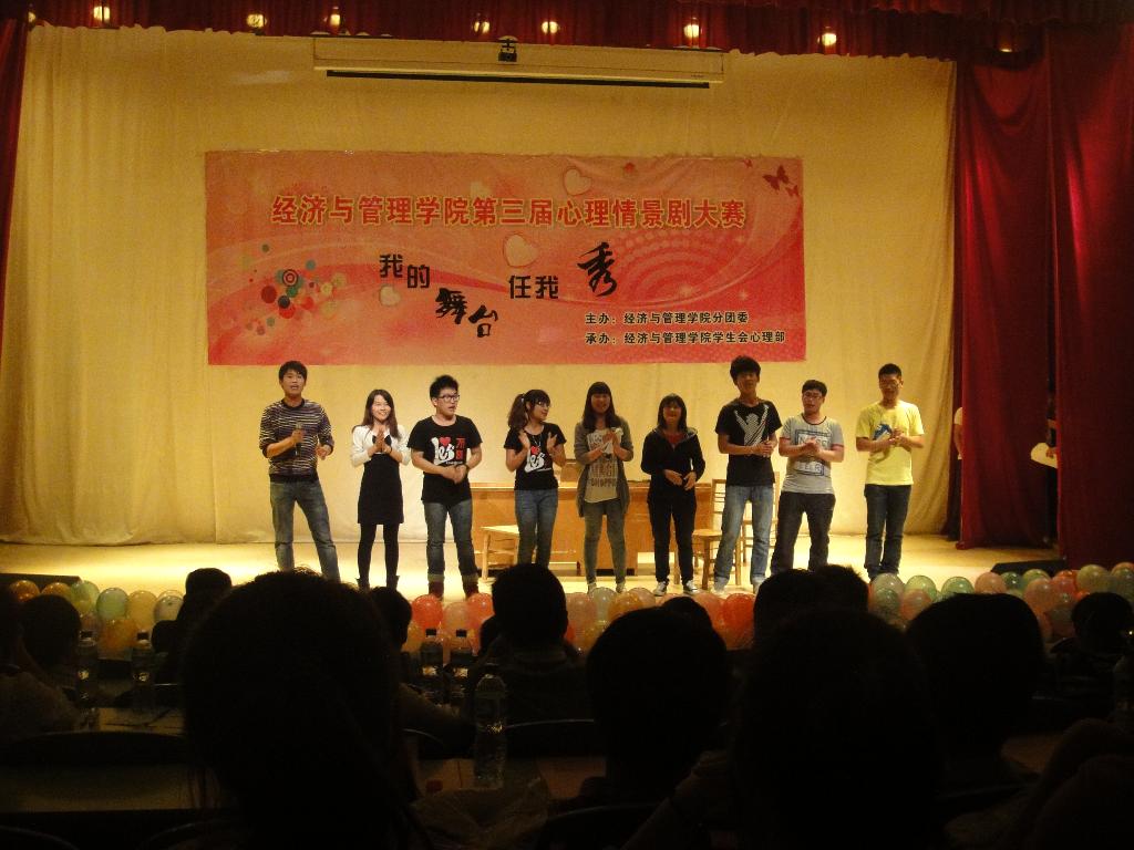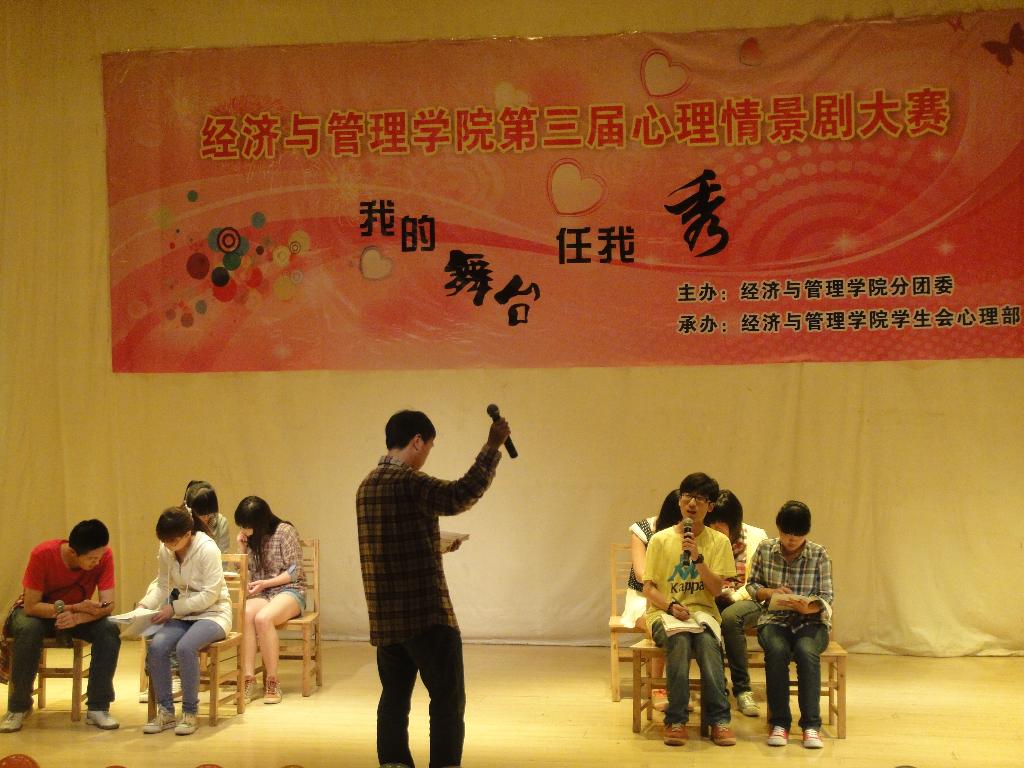 为了进一步提高同学们的心理健康素质,传播心理健康与理念,激发同学们对身边生活的体验,关注自我心灵的健康,形成一种发现、思考、解决心理健康问题的新方式,2013年5月8日晚上7:00,经济与管理学院在我校科学校区电教楼208室隆重举行了我院第三届心理情景剧大赛。