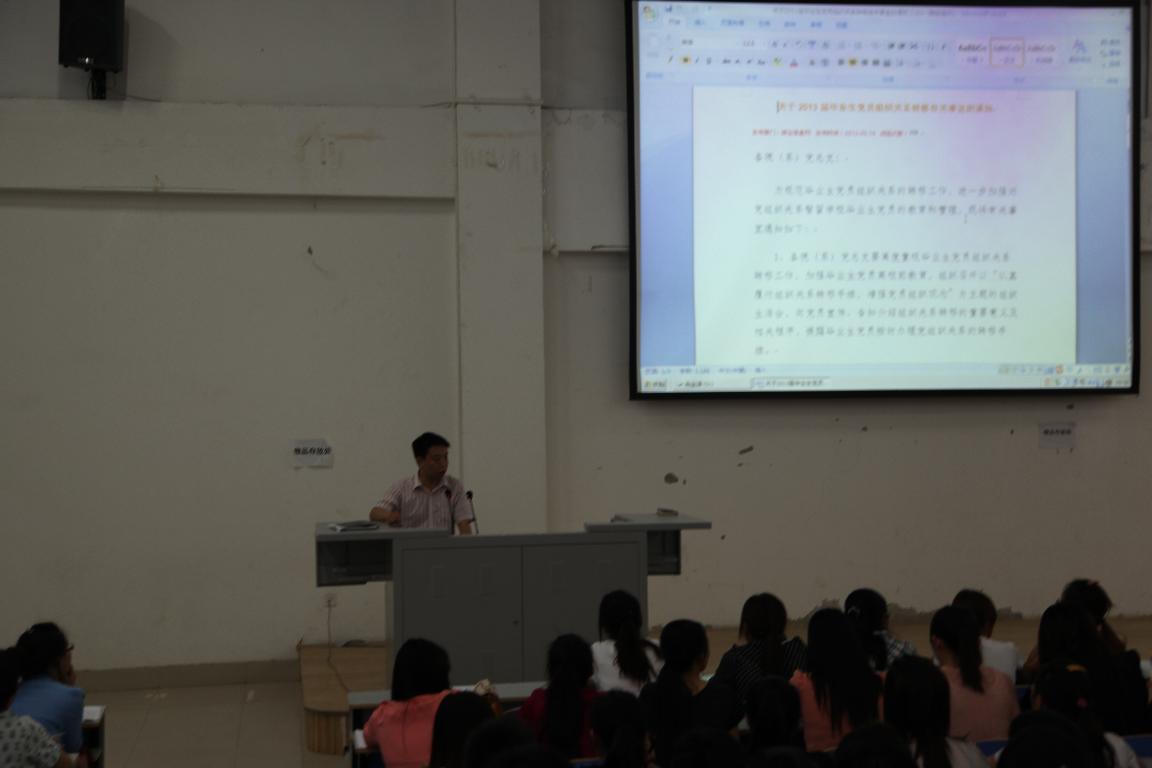 会上吴书记结合深入贯彻落实习近平总书记在党的十八届二中全会第二次会议和十二届全国人大第一次会议上的重要讲话精神对毕业生党员进行了学习和教育,同时要求党员同志要通过高质量、高标准做好毕业前的各项工作来为同学们发挥示范作用,要求党员同志通过积极关心和帮助同学发挥党员的先锋作用,在为同学们服务过程中体现党员的理想和价值。然后尚金清老师根据学校党委组织部《关于2013届毕业生党员组织关系转移有关事宜的通知》要求就毕业生党员组织关系转移的有关事宜逐项给党员同志进行了说明,对各类情况的办理做了要求,同时要求党员同志要用高度的责任意识完成各项工作,严格执行党员联系同学制度,在为同学们服务的过程中严格按党员的标准要求自己,热心为班级和同学服务,确保毕业生文明离校。
