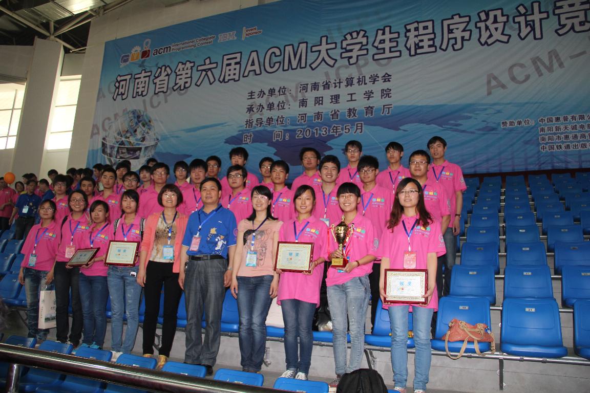 5月11-12日,在河南省教育厅、河南省科协的指导下,由河南省计算机学会主办的“河南省第六届大学生程序设计竞赛”在南阳理工学院隆重举行。全省32所高校的127个代表队参加了本次竞赛,我校派出的8支正式代表队均荣获奖牌:2项金奖、4项银奖、2项铜奖和“最佳女队”奖。