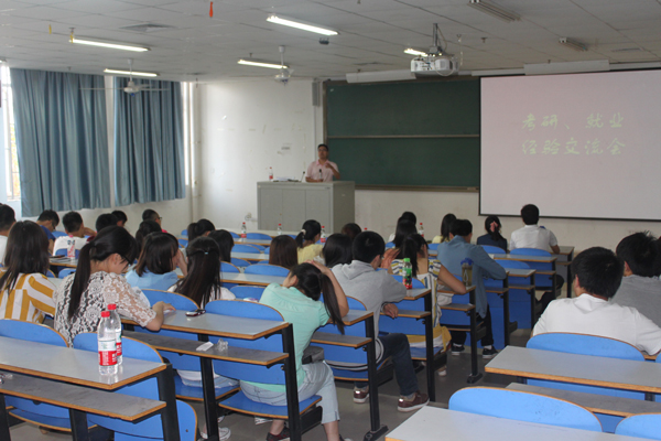 交流会上,首先由2013届考研学生讲述他们的考研经历和感悟,他们以自身为例,从各个学科出发,详细讲解了自己的学习方法及应试技巧,并分享了备考期间调整心态的方法;随后是现场提问环节,在场的低年级同学们抓住机会,踊跃提问,无论是跨专业考研还是选学校等问题,都得到了逐一解答,使同学们对考研有了进一步认识。接着,几位已签约工作的毕业生代表向同学们讲述了他们找工作的经历,告诉同学们要认清当前就业形势,树立正确的择业观,并强调了在校期间提高自身综合素质的重要性,在场同学认真聆听,深受启发。最后,在场学生表达了对毕业生们参加此次交流会的感谢之情,老师为毕业生们送上了美好祝福,会议持续了将近两个小时,圆满结束。