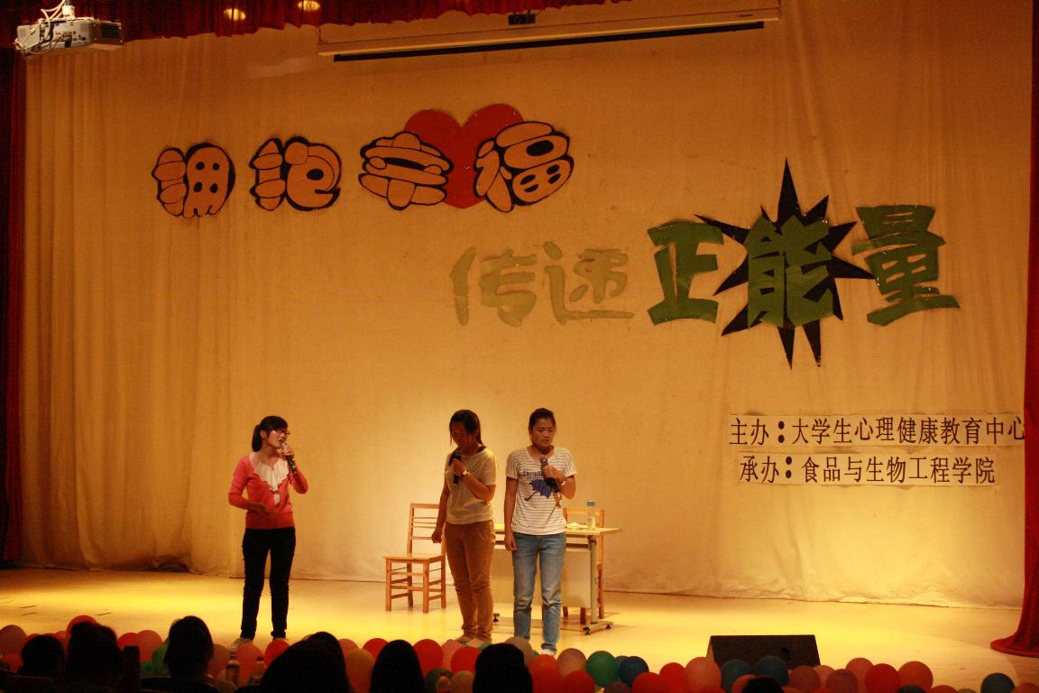 在学校心理健康宣传月期间,学校心理健康教育中心在两个校区开展了心理情景剧大赛,旨在通过大学生喜闻乐见的新式传播心理健康观念和知识。5月16日下午,经过认真组织和悉心准备,由校心理健康教育中心主办,食品与生物工程学院承办的主题为“拥抱幸福,传递正能量”的科学校区第三届心理情景剧大赛预赛在电教楼208成功举办。