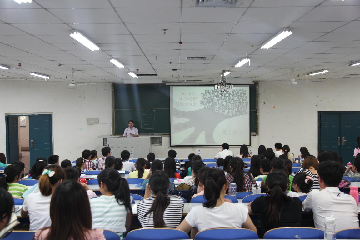 吴占超副书记就食工学院近几年的考研及就业情况作了说明,就明年的就业形势进行了预测,动员和鼓励学生们开阔视野、扩大就业渠道,积极备考研究生和参加就业单位招聘,同时要求同学们之间要相互鼓励、相互支持、相互帮助,营造良好的氛围。刘延奇副院长对考研目标的明确、困难的克服、面临的抉择以及相关注意事项做了较为详细的讲解。最后,考取中国农业大学、江南大学等名牌大学研究生及部分就业突出的2013届毕业生代表总结了部分考研科目的备考方法、就业技巧、特别注意事项,积极和同学们交流心得体会,把成功的经验与学弟学妹进行了分享。