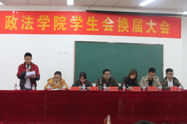 换届大会中,学生会上届主席吴广胜和本届主席段宗武分别作了总结报告和工作展望,分团委书记张宏英老师宣读了新一届学生会成员名单。最后郭祥远副书记对上一届学生会取得的成绩给予了肯定并对新一届学生会提出要求,希望大家在认清形势、理清任务的前提下,团结合作,高标准严要求,继承优良作风,求真务实,开拓创新,拓展政法学院学生会工作新局面,为学校和院系发展做出更大的贡献。