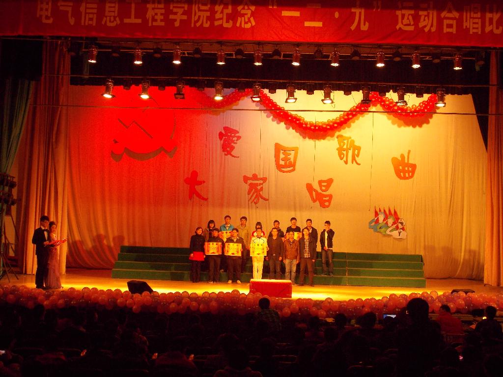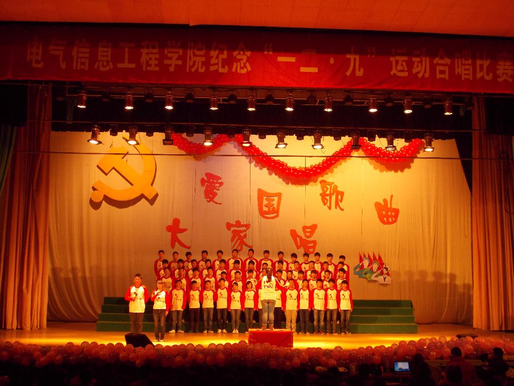11月17日15:00,电气信息工程学院在大礼堂举行“爱国歌曲大家唱”——纪念“一二•九”运动78周年合唱比赛。学院2013级七个专业班级代表队参加比赛,各专兼职辅导员及学生代表一千余人观看比赛。学院党总支副书记宋文军老师出席并作总结讲话。