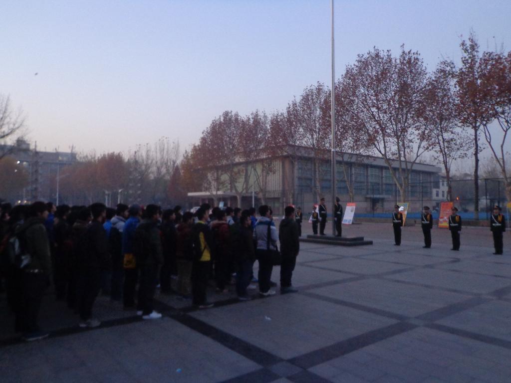 早上六点五十,升旗仪式正式开始。伴随着雄壮的《义勇军进行曲》,在全体同学行注目中,五星红旗冉冉升起。同学们满怀崇敬,表情庄重。庄严肃穆的升旗仪式深深激发了同学们强烈的爱国热情。