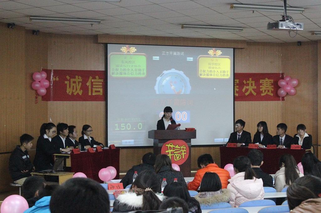 “诚信校园行”2013年辩论赛决赛于12月8日下午在东风校区教三楼103举办。来自郑州轻工业学院东风校区和科学校区的六支参赛队伍进入了决赛。