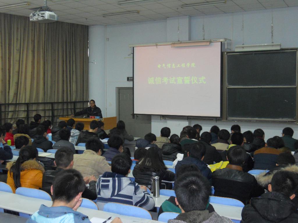 12月12日下午4:00,电气信息工程学院在教三楼301召开期末考试动员大会,并进行诚信考试宣誓仪式。学院各专业班级主要学生干部及学生代表参加动员会并宣誓。学院分团委书记许海龙老师参加会议并讲话。