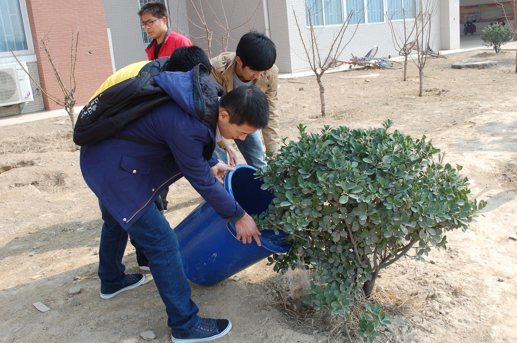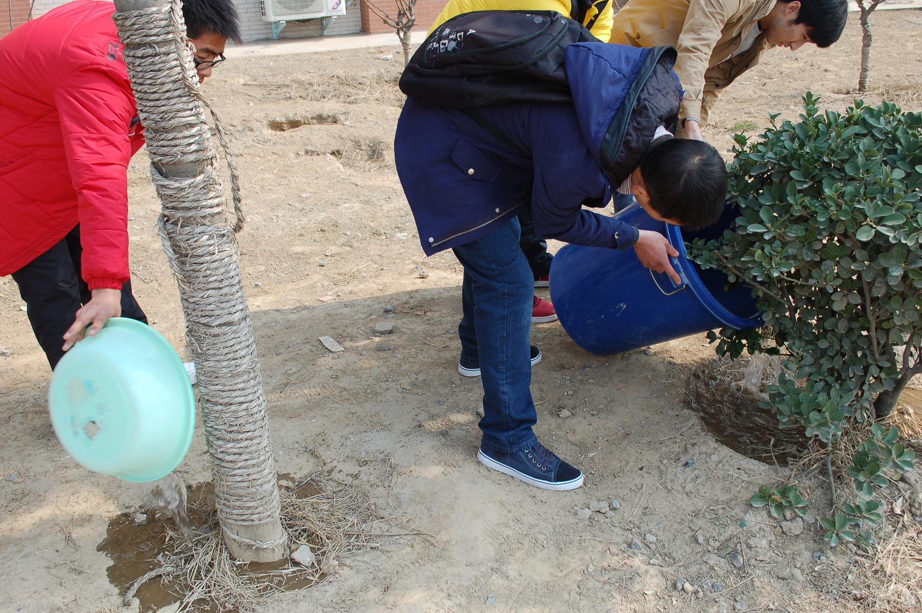 活动前大家热情洋溢,踊跃报名。到达现场后,同学们先对现场的垃圾进行了清理,随后对自己负责的树苗先挖坑,后浇水,每位同学都从自己的宿舍带来了水盆、水桶,以最饱满的热情投入到了活动当中。时值风沙天气,活动现场却呈现出一片欢声笑语、热火朝天的劳动场面。经过一个多小时的辛勤劳动,活动场地变得干净、整洁,树苗全部浇灌完毕。