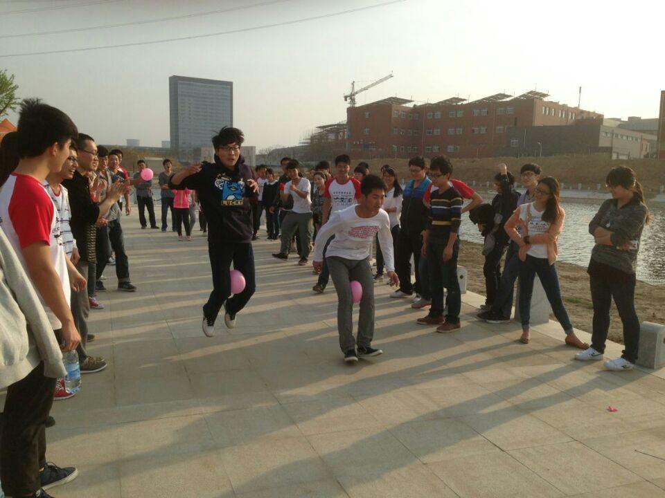 本次素质拓展训练主要包括三项拓展项目:“萝卜蹲”、“地雷阵”和“袋鼠赛跑”。“萝卜蹲”:主要将参与者分成四组,每组人手牵着手围成一圈,每堆人以颜色命名,任意指定一堆萝卜开始统一下蹲,同时还要念词,再指定别的萝卜堆做同样动作。这项训练不仅考验了大家的记忆能力,还考验了大家的反应速度,为同学们带来了无限的乐趣。“地雷阵”:让每个队员找一个自己的搭档,给每对搭档发一块蒙眼布,每队搭档中要有给一个人蒙上眼睛,眼睛蒙好之后,可以布置地雷阵,划分区域,找一个起点和终点。这项训练主要增强成员之间相互信任、沟通与交流的重要性。“袋鼠赛跑”:每队搭档一人站在起点,一个人站在终点,由起点的那个同学先跑,跑的时候要把气球放在膝盖之间,放好之后不能用手去碰,要像袋鼠一样跳到终点,并且保证气球不能掉,跑到终点时候把气球给另一个人,交换之后由另一个搭档夹着气球跳到起点。这项训练主要培养团队的合作精神。