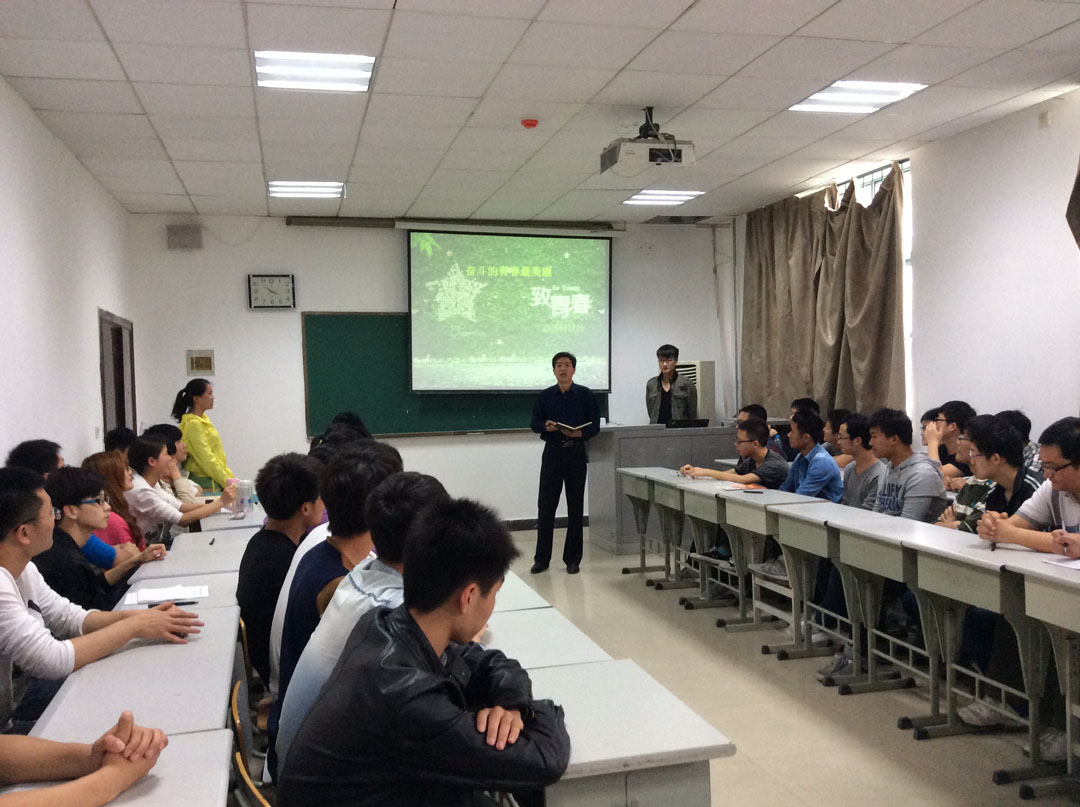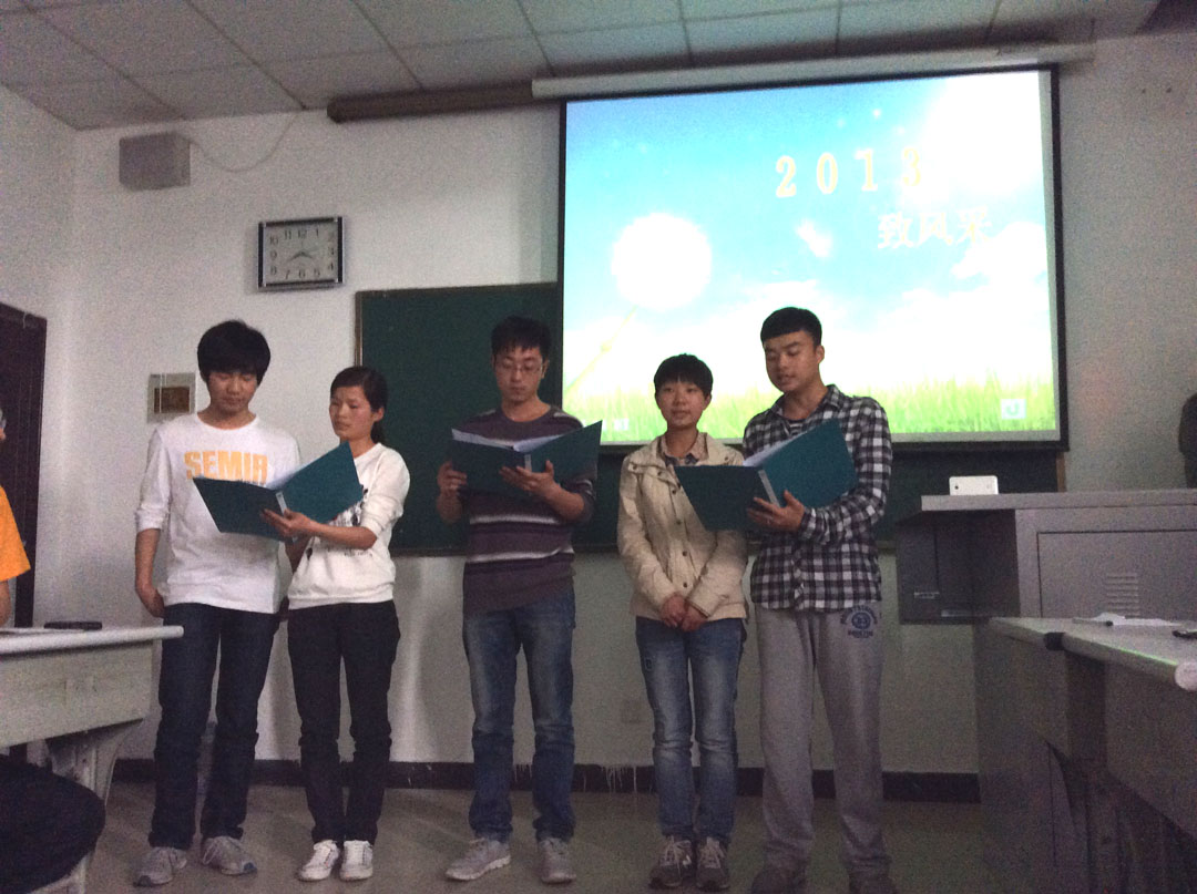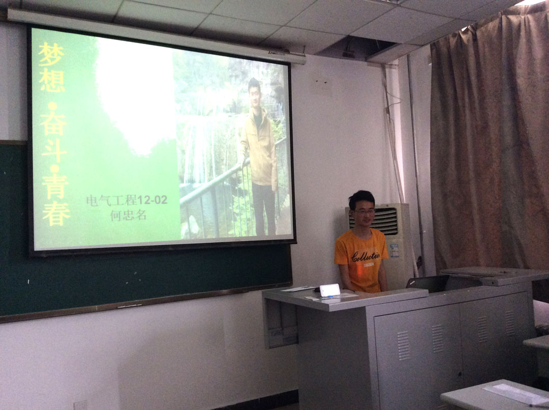 团日活动在简短而振奋的“五四”短片中拉开帷幕,九十五年前青年学生百折不挠、自强不息的奋斗精神令到场的所有人为之一振。随着主持人深情的朗诵,时间来到了2012年9月——电气工程及其自动化2012-2团支部成立之初,一张张照片,一幅幅图画展现出支部奋斗、成长历程:学习的艰辛,生活的苦涩,娱乐的欢快,运动场的汗水,收获的喜悦……一个小小的信封,给大家带来了惊喜,品读两年前写下的大学目标,大家感慨时间飞逝,奋斗才刚刚开始。自由讨论中,学习达人介绍了自己如何在学海中努力徜徉,最终获得国家励志奖学金,同时又积极投身社会实践和各项活动,取得不俗成绩。最后,激昂的《奔跑》歌声中,支部全体成员修正自己的目标,将梦想的信封封存,相约两年后再次开启梦想的翅膀。