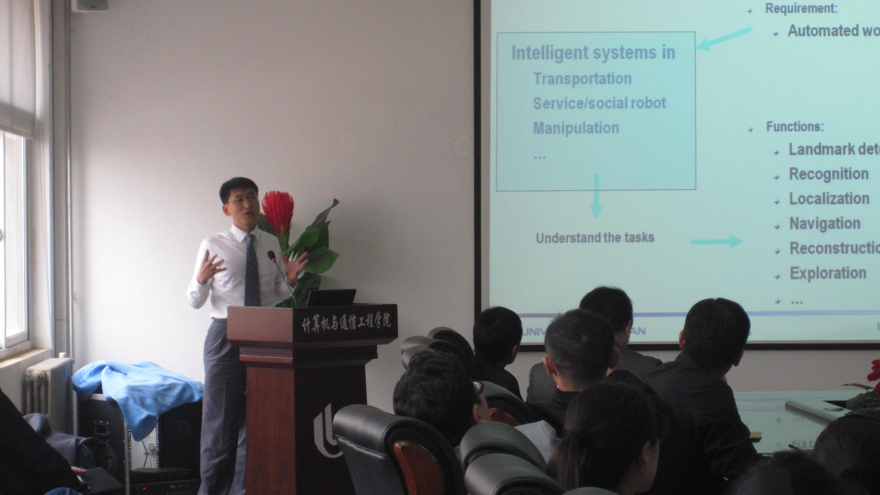 2014年4月28日下午14:30,韩国蔚山大学Kang-HyunJo教授应邀在科学校区计算机与通信工程学院213会议室做题为“Computer Vision For the Real Application”的学术报告,报告会由主管科研工作的金保华教授主持,计算机与通信工程学院的相关专业的教师和全体研究生听取了此次报告。
