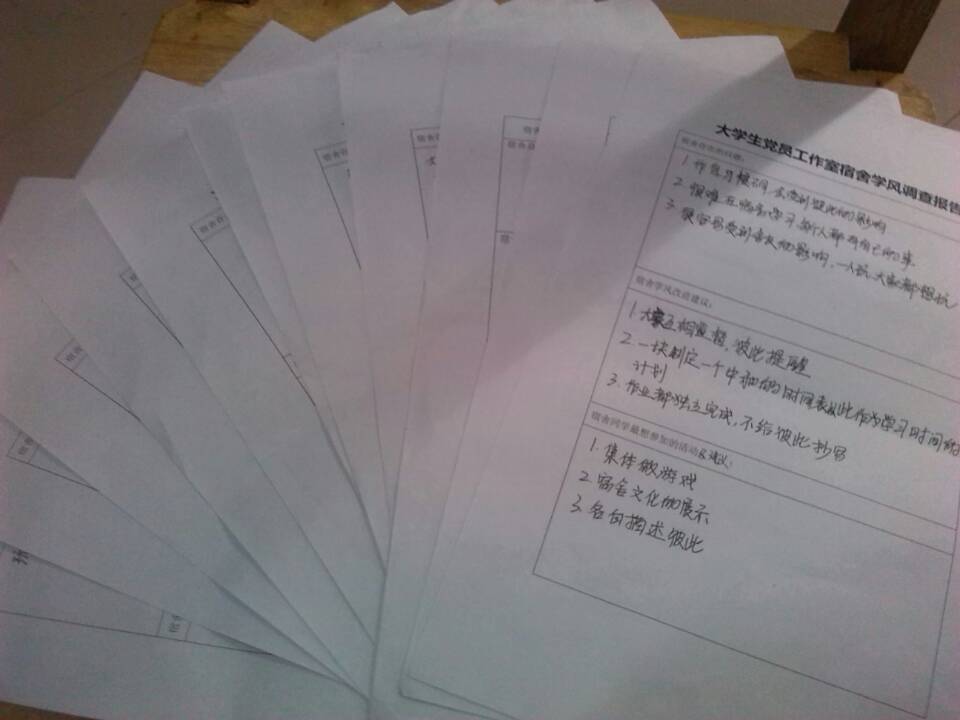 活动初期,不定时深入学生宿舍,了解学院宿舍日常真实氛围,组织学生填写《计算机与通信工程学院宿舍学风问卷调查》,对宿舍舍风、学风进行摸底,建议学生走出宿舍,走出网络,走向操场,进入教室,多锻炼,多学习。根据调查结果,综合学习成绩,推荐40个宿舍参加后续比赛。