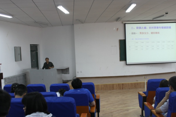 栗老师指出婚姻是社会的基础,但是如今农村的男青年却面临择偶的巨大困境,如何分析及应对这一问题以保证社会稳定是我们急需关注的重要方面。栗老师分条阐述了造成困境的原因和解决问题的办法,用文字、数据、图表、图片深刻又生动地剖析了这个社会问题,同学们都深深的被这个课题和栗老师幽默的讲课风格所吸引,时而沉思,时而大笑。