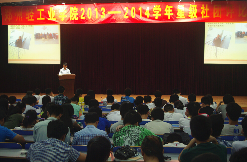 ,大学生社团联合会于科学校区活动中心208室开展了郑州轻工业学院2013—2014学年星级社团评比活动。大学生社团联合会主要干部及各校级社团代表共计500余人参与了本次活动。