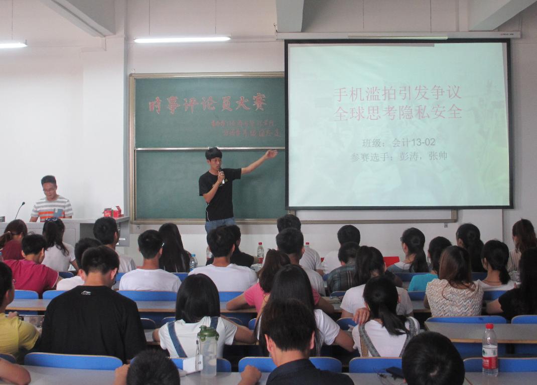 本次大赛分为时事开场白、时事面对面和即兴抢答三个环节。在第一环节,各班代表按照之前抽签决定的顺序依次上台对最近发生的国内外大事进行阐述,并表达自己的观点。选手们的表现抑或严肃、抑或活泼,有的以情见长,有的以理服人,发挥专长,各显风采。在第二个环节,选手们随机抽取题目,并对所选题目进行评述,大家博采众长,获得了现场观众一阵阵的喝彩。在第三环节,大家更是充分准备,积极抢答,将比赛不断推向高潮。经过激烈的角逐,财务管理12级01班代表队荣获了本次大赛的第一名。