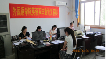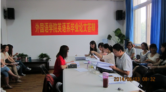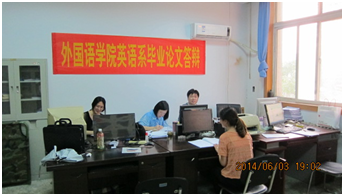 按照学校“关于2014届本科毕业设计(论文)答辩工作安排的通知”精神要求,外国语学院精心组织,认真安排。在各位答辩教师和参加答辩学生的共同努力下,截止6月4日下午6点,各答辩专业圆满完成了专业答辩计划。目前正在紧张有序地进行学生成绩的汇总、整理,以及参加学院二次答辩学生名单的推选。
