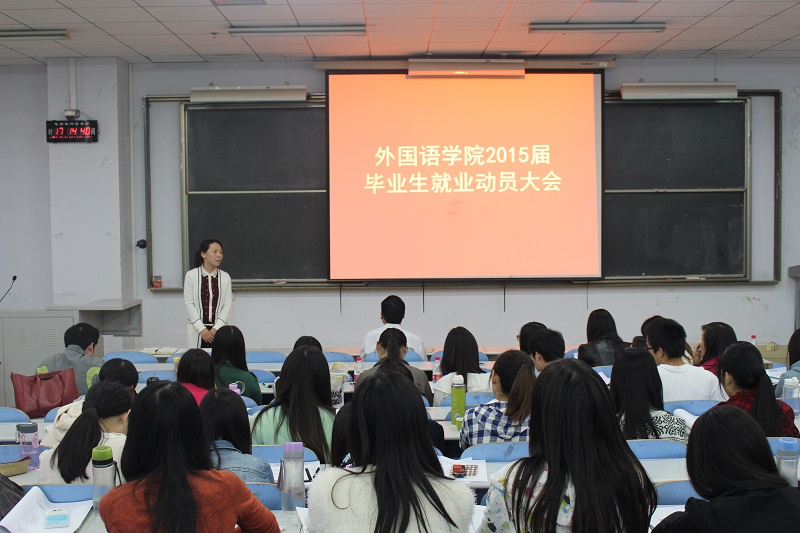 10月16日下午4:00,外国语学院在教三楼204教室召开2015届毕业生就业指导及动员大会,党总支副书记孔祥娟老师、负责就业老师、毕业班班主任和全体15届毕业生参加了此次大会。