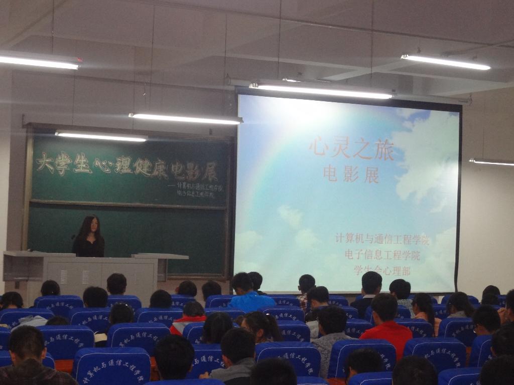 晚,计算机与通信工程学院(电子信息工程学院)在计算机楼217教室举办 “心灵之旅”大学生心理健康教育电影展。本次活动是我校心理健康教育宣传周系列活动之一,我院各年级各班心理健康委员和2014级同学到场。