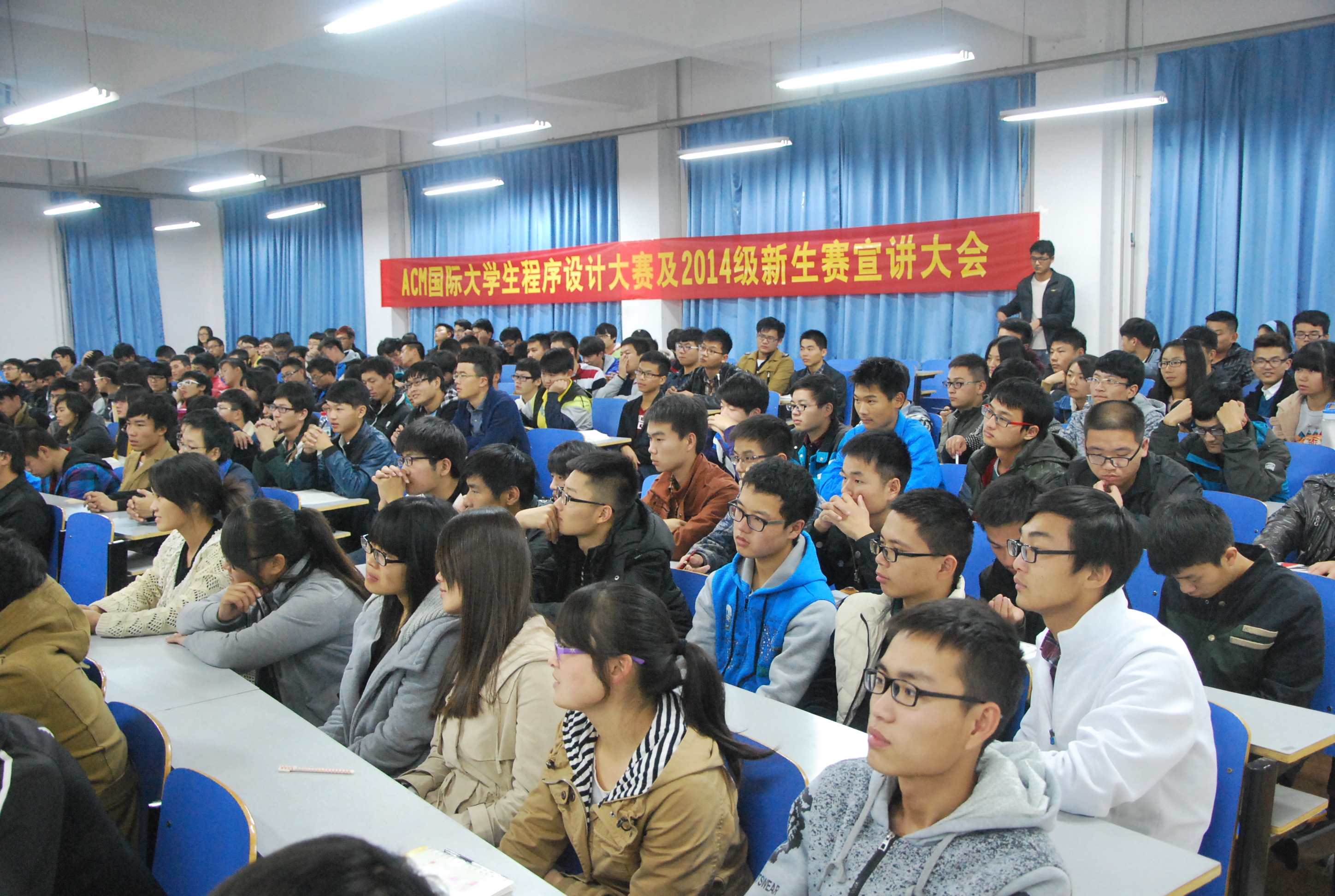 会上,李晔老师首先介绍了ACM国际大学生程序设计大赛的概况、意义及我校近几年在省内和亚洲赛区获奖情况;然后,通报了新生赛的赛程安排和奖项设置,并对同学们提出了殷切希望,希望同学们能借助ACM竞赛平台,扎扎实实地学好C语言、锻炼好专业基本功,为后继课程的学习打下坚实的基础;最后,ACM省赛亚军获得者、12级集训队队长魏鑫及其队友张叶通过亲身经历,分享ACM程序设计竞赛生涯中的苦涩和欢乐:虽然失去了假期、经历了重重失败,但怀揣对知识的渴望,对程序设计的热爱,与志同道合的同学,坚持不懈,共同学习,共同提高,最终收获了成功,倍感充实;同时也感谢学校和学院为大家提高了一个学习、交流、提高的平台。