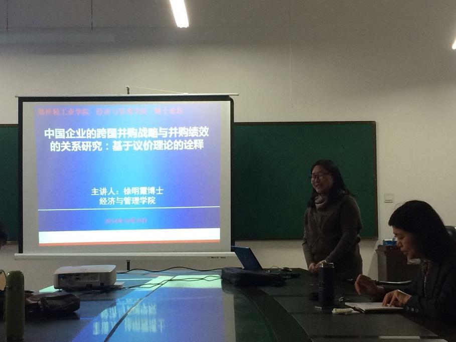 2014年10月30日上午,经济与管理学院徐明霞老师在科学校区经管学院楼308教室为广大师生作了“中国企业的跨国并购战略与并购绩效的关系研究:基于议价理论的诠释”的学术报告。经管学院多名教师、研究生参加了学术报告。