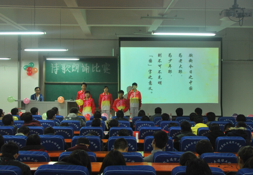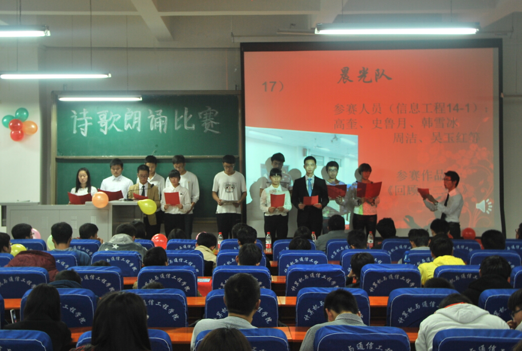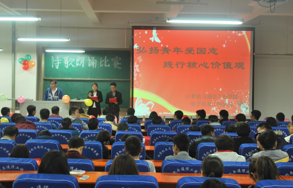 为纪念“一二·九”运动79周年,激发广大学生的爱国热情,铭记历史,加强爱国主义教育,11月30日晚19点计算机与通信工程学院(电子信息工程学院)在计算机楼217举办了“一二九爱国诗歌朗诵比赛”,学院2014级全体新生参加了此次活动。