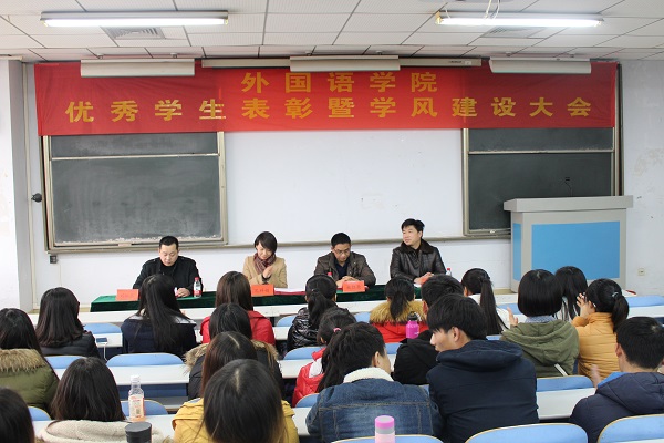 12月25日,外国语学院2014年优秀学生表彰暨学风建设大会在教三楼104教室召开。学院党总支书记杜红亮、副院长周麦成、副书记孔祥娟出席会议,为获奖学生颁奖。
