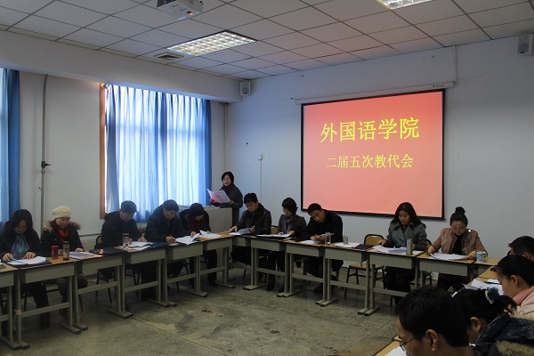 2015114日下午,外国语学院二届五次教职工代表大会在东二楼409室举行。会议由学院分工会主席孔祥娟主持,学院全体教职工代表参加了会议。