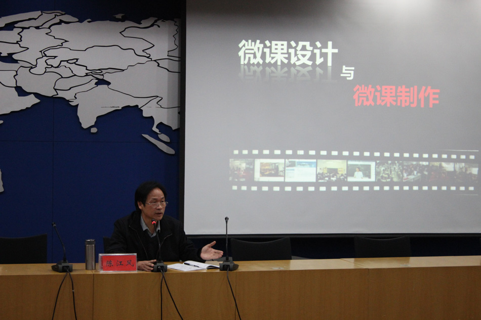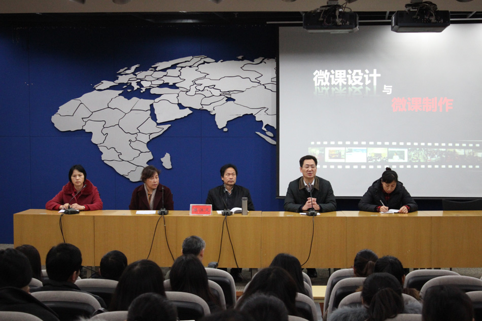 最后,陈江风副校长作重要讲话。陈校长指出,今天会议的召开对学校课程改革尤其是微课群建设非常及时、到位。当前,我校要建立基于信息化背景下学习型高校,课程改革和信息化技术的有效融合是一个重要抓手,与传统课程、尤其是传统的各类网络课程相比,微课制作是一种基于网络快速发展的崭新的课程理念,其在传播效果,特别是学生的认可程度上具有更大的优越性。学校启动微课群建设项目,近期迅速进入了立项、制作等实质性阶段,其宗旨是要推进教学工作的与时俱进,让更多的老师多掌握一项技能,投入课程改革,为学生学习创造更宽阔的空间,进一步提升教学水平和教学质量。最后陈校长对相关职能部门和课程负责人提出了希望。微课建设仅靠教师单方是不够的,相关职能部门要为课程制作教师提供政策和条件支持。各位老师要有超越自我的自觉性,努力增强适应性,在具体策划时要做好分工,协同制作,力争制作高水平微课,打造学校品牌。