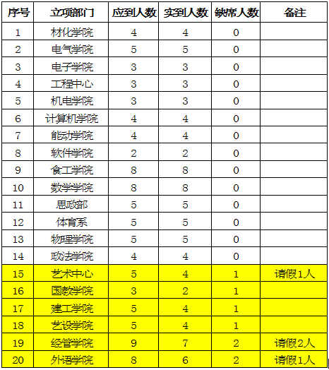 注:缺席人数相同根据院系名称拼音首字母、请假情况排序。
