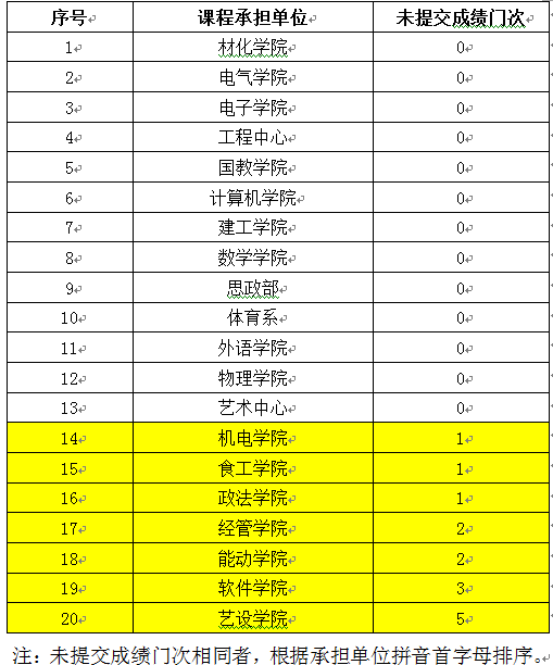 按照郑州轻工业学院成绩管理规定,任课教师应于课程教学和实践环节考核结束后1周内完成成绩的提交工作,在考试周结束一周后,仍有个别教师无故未按时提交成绩。各教学单位提交成绩情况见附表,未提交成绩的详细情况见附件(2014-2015学年第一学期教师未按要求提交成绩一览表)。