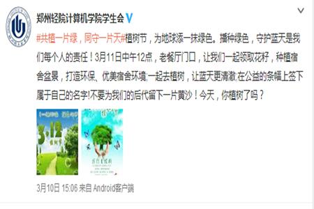 3月10日,我院在学院学生会官方微博发起“共植一片绿,同守一片天”活动,号召同学们行动起来,以实际行动为绿色、环保做出自己的一份贡献。