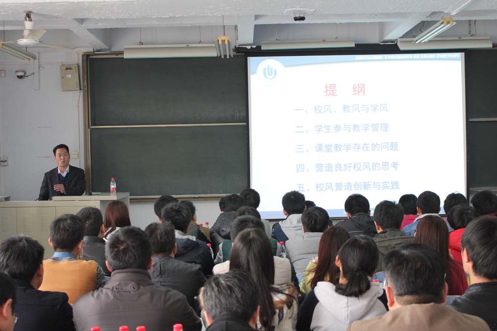 按照学校“校风营造创新与实践”工作整体策划,本学期将由教务处、校督导室及学生处相关人员有针对性地对工作组成员以讲座和研讨等方式进行指导和交流。启动会上,教务处张东初处长首先以“营造优良校风的思考与策划”为题开讲第一课,张处长主要从五个方面对如何营造优良校风提出了思考和策划。一是校风、教风与学风。张处长以高校校风、教风与学风的辩证关系为切入点,对高校校风、教风、学风存在的问题进行了分析,提出了校风建设是根本,教风建设是关键,学风建设是核心的基本思路,强调了营造优良校风、教风、学风的重要意义;二是学生参与教学管理。张处长从历史依据——学生大学、哲学依据——学术自治、经济学依据——高教与社会接轨、管理学依据——参与式管理等四大依据出发,有理有据地论证了学生参与教学管理的意义和作用,结合我校实际,提出了教务助理制度和教学信息员制度等学生参与教学管理的基本运作方式;三是课堂教学存在的问题。张处长从教师、学生及教学管理三个层面,分别剖析了课堂教学中存在的问题及原因,并提出了相应的解决策略;四是营造良好校风的思考。张处长以教育部、教育厅、学校2015年教学工作要点为指导思想,提出了教务处2015年“质量提升年”的教学主题,对围绕营造良好校风的“课堂教学视频检查、青年教师教学信息系统、晋升职称人员教学考核、网上评教改革、规范毕业设计(论文)管理、视频监考”六项举措进行了详细的解读;五是校风营造创新与实践。张处长对获聘的“校风营造创新与实践”的同学们表示祝贺,同时也从课程安排、管理形式、运行方式等方面对同学们参与教学管理工作进行了整体的安排。