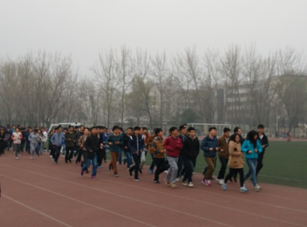 升旗仪式后,同学们响应学院分团委开展“三走”活动号召,来到操场开始晨跑。