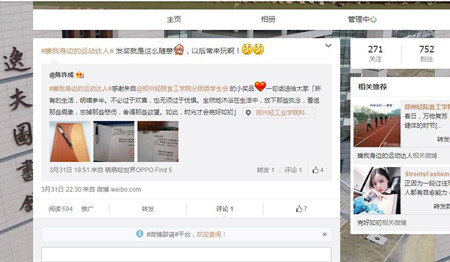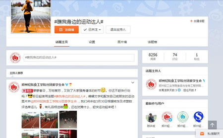 3月25日,我院通过分团委官方微博开设“瞧我身边的运动达人”微话题,鼓励全院同学参与,分享体育锻炼中的美好瞬间和快乐时刻,并根据转发及点赞数进行幸运评选活动,运用新媒体营造了青春健康快乐的校园氛围。