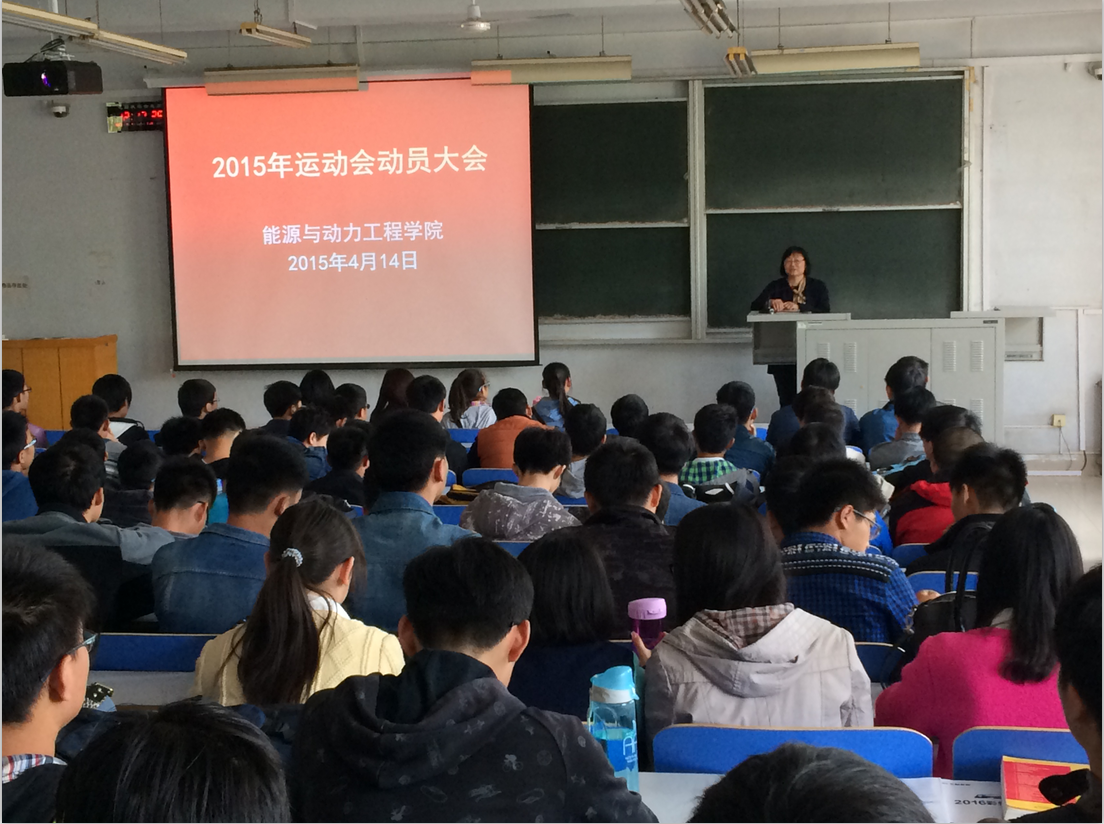 在2015年校春季运动会即将到来之际,为充分调动运动员的积极性,保障运动会期间各项工作有序进行,4月14日中午12:10,能源与动力工程学院在东风校区东一楼300召开运动会动员大会,学院党总支书记邵建敏、全体专兼职辅导员以及运动员、方阵成员、健美操队成员、志愿者代表参加了会议。