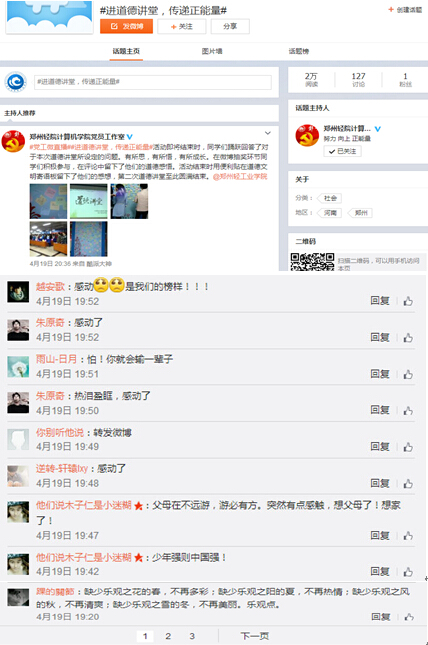 活动进行过程中,利用微博互动平台,场外和场内的同学积极参与,反响热烈。大家纷纷表示,道德就要从你我做起,从平时做起,从关心周围的人做起,努力做一个优秀道德的自觉践行者和积极传播者。